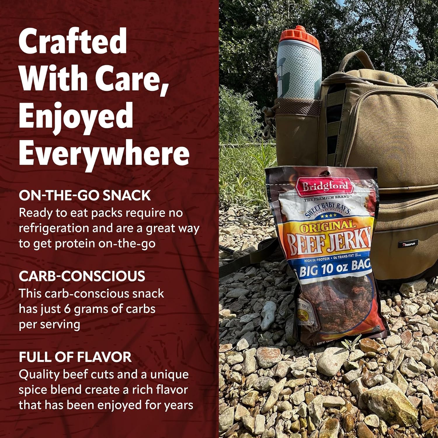 Bridgford Beef Jerky is made from the finest quality cuts of beef with our signature blend of spices to give it that distinct rich flavor that our customers have enjoyed for years. Winner of the 2008 Men’s Health Nutrition Award, this carb-conscious snack is just the thing to satisfy your taste buds. Take this snack anywhere, it’s the perfect choice for a busy lifestyle!